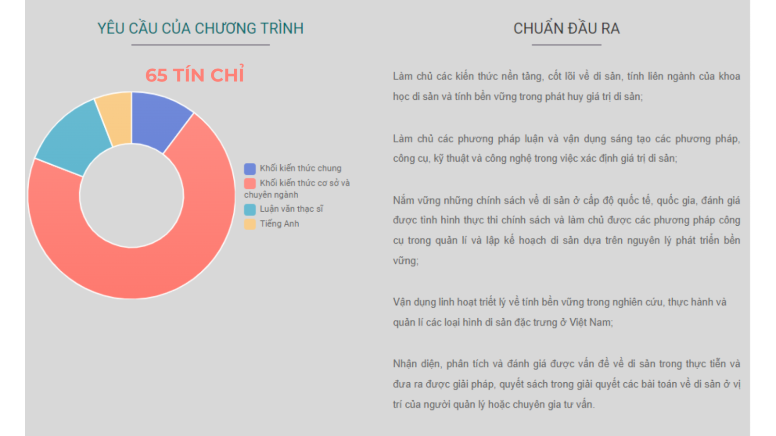 Chương trình thạc sĩ di sản học định hướng nghiên cứu nhằm cung cấp nguồn nhân lực chất lượng cao phục vụ công tác nghiên cứu, bảo vệ, phát huy giá trị di sản. Chương trình đào tạo trang bị cho học viên kiến thức cập nhật và nâng cao về di sản để có thể nhận diện, tổ chức và tham gia giải quyết các vấn đề về di sản trong thực tiễn với tư duy và cách tiếp cận liên ngành.
