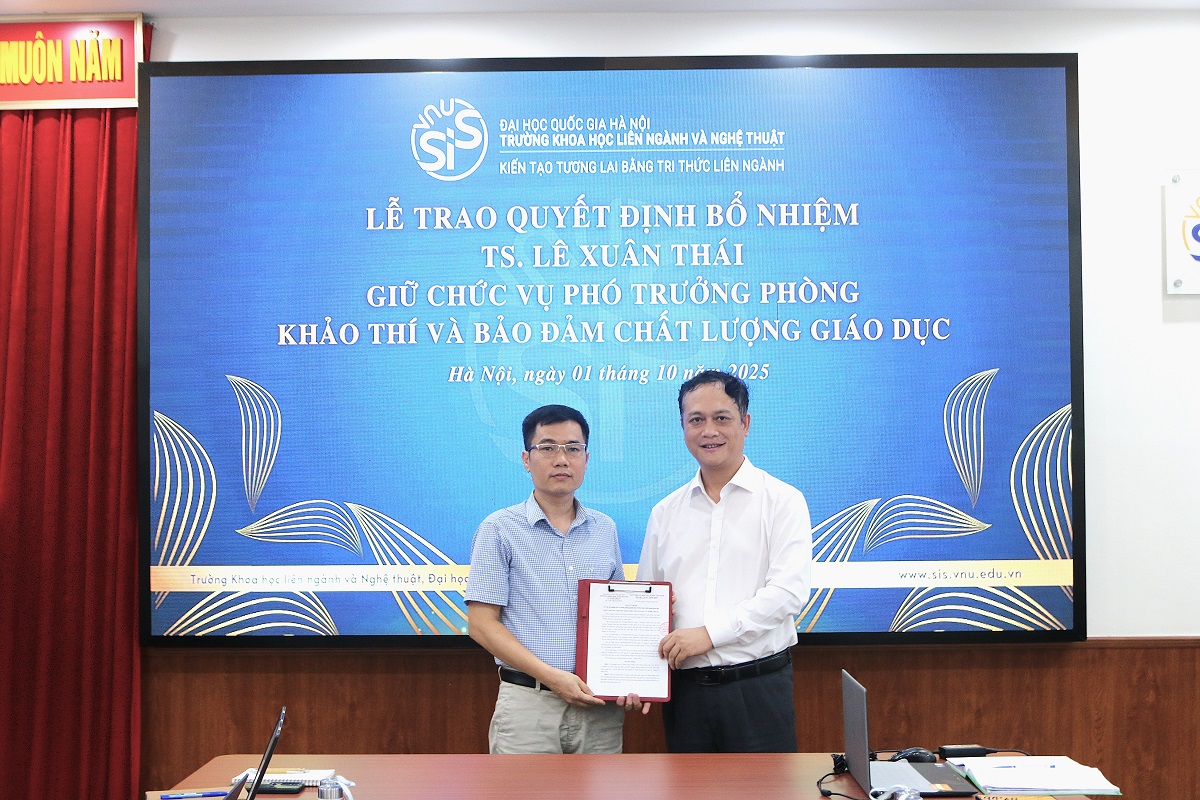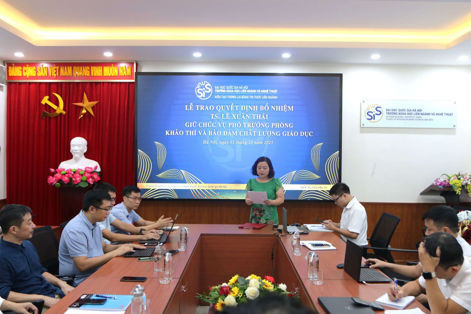Chiều ngày 01/10/2025, Trường Khoa học liên ngành và Nghệ thuật, Đại học Quốc gia Hà Nội tổ chức Lễ công bố Quyết định bổ nhiệm chức danh Phó Trưởng phòng Khảo thí và Bảo đảm chất lượng giáo dục cho TS. Lê Xuân Thái.