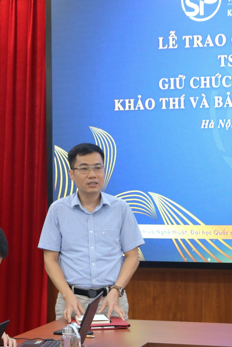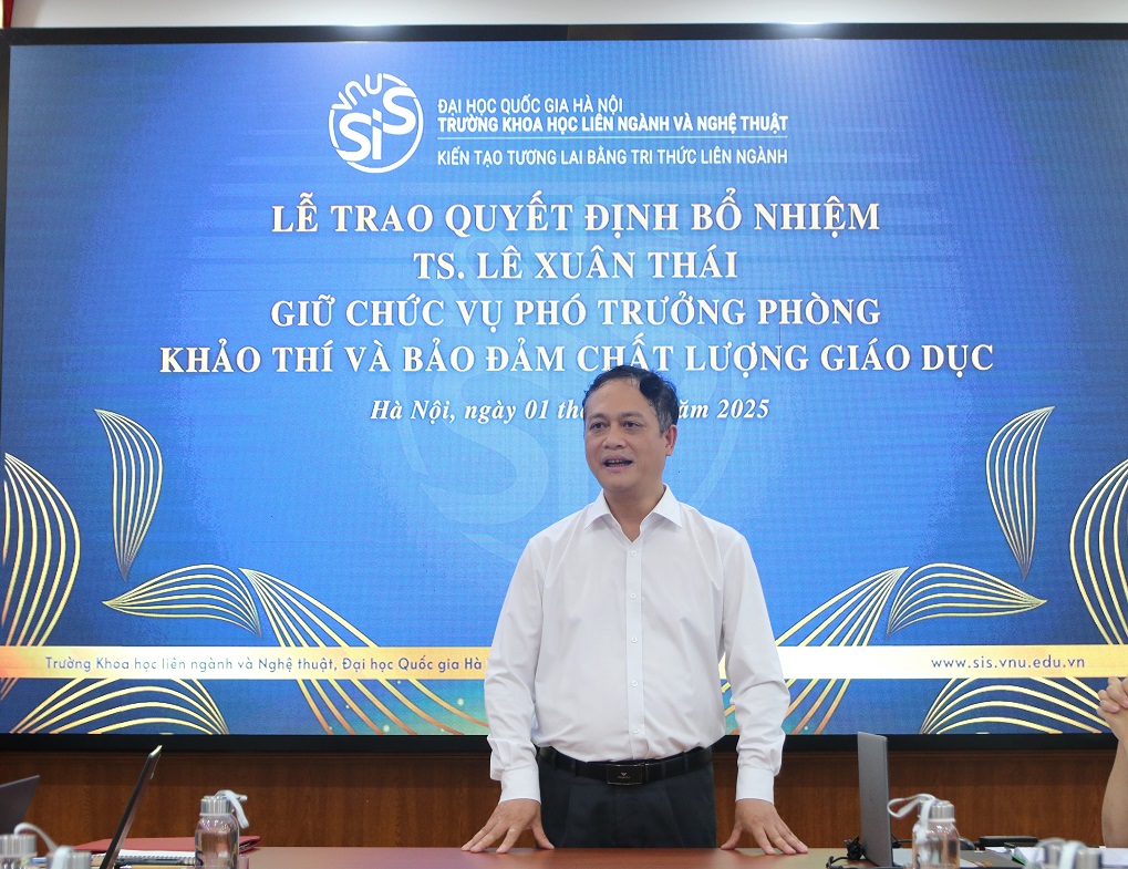 Tại buổi lễ, sau khi đồng chí Nguyễn Thị Mai Lan - Phó Trưởng phòng phụ trách, Phòng Tổ chức - Hành chính công bố quyết định số 1508/QĐ-KHLNNT ngày 29/9/2025 về việc bổ nhiệm chức vụ Phó Trưởng phòng Khảo thí và Bảo đảm chất lượng giáo dục đối với TS. Lê Xuân Thái, PGS.TS Nguyễn Văn Hiệu trao quyết định choTS. Lê Xuân Thái và phát biểu chúc mừng đồng chí. Đại diện Nhà trường, PGS.TS Nguyễn Văn Hiệu đánh giá cao quá trình công tác, cống hiến và kinh nghiệm của đồng chí Lê Xuân Thái. Đồng thời bày tỏ sự tin tưởng, với kinh nghiệm lâu năm của mình trong lĩnh vực chuyên môn, TS. Lê Xuân Thái sẽ hoàn thành tốt nhiệm vụ được giao, có nhiều đóng góp và cống hiến cho Trường Khoa học liên ngành và Nghệ thuật, Đại học Quốc gia Hà Nội.